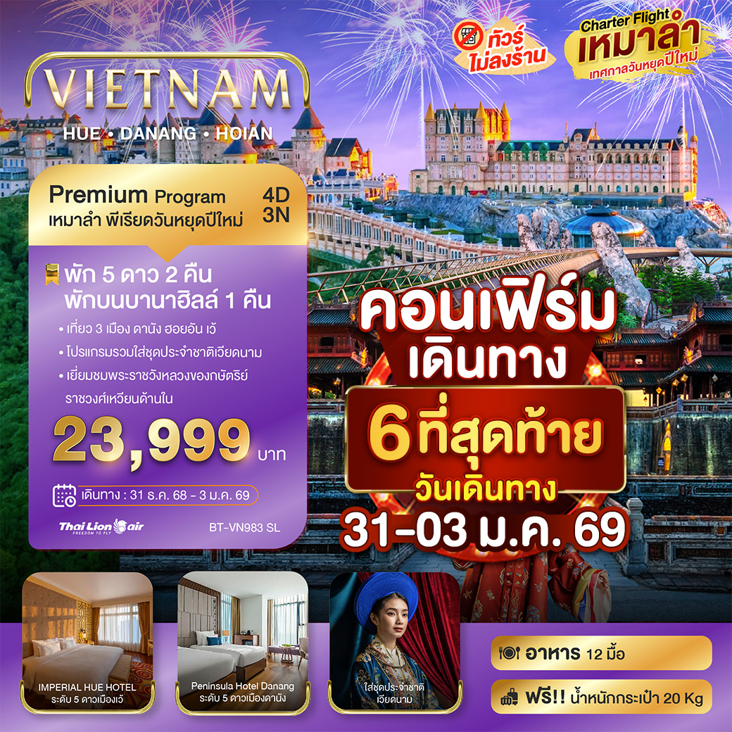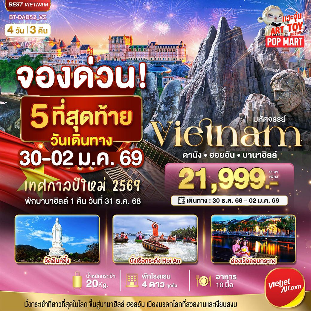 บินเหมาลำ ฉลองเทศกาลปีใหม่ ดานัง ฮอยอัน บาน่าฮิลล์ (พักบาน่าฮิลล์คืนวันที่ 31 ธ.ค. 68 และ 01 ม.ค. 69